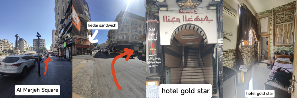 النجم الذهبي (Hotel Gold Star) Google map: https://maps.app.goo.gl/GyRwW2zgsRDYfvibA Price: USD13 per night (single bed) Direction to hotel: From Al Marjeh Square, follow the arrows in below pictures. At the crossing that has a sandwich stall, turn right and the hotel is located at the alley. Notes: The receptionist doesnt speak English. If you can speak arabic, it would be helpful.