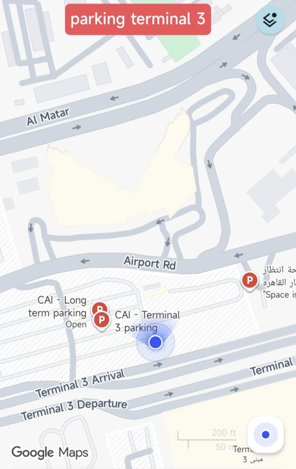 Distance from Terminal 2 arrival hall to Terminal 3 parking area is just few minutes walking. Go to B-5 sign at the parking and call uber there. Trip from airport to city center (al nasr) costs me LE150 (EGP40 for parking fee is already included). No other extra charges from what is stated in the uber. In fact, when exiting the parking, my driver didnt need to pay the parking fee anyway.